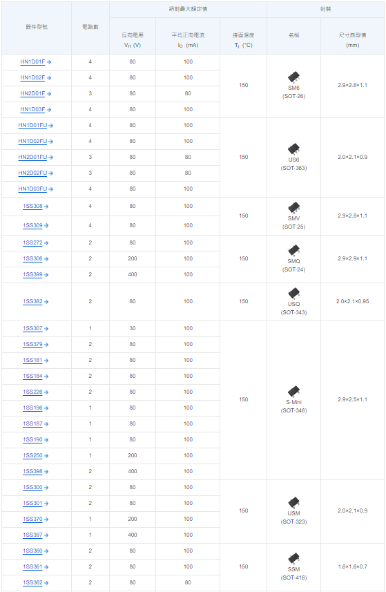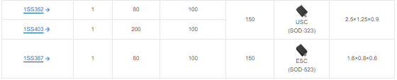 [2] 對象封裝 : SM6 (SOT-26), US6 (SOT-363), SMV (SOT-25), SMQ (SOT-24), USQ (SOT-343), S-Mini (SOT-346), USM (SOT-323), SSM (SOT-416), USC (SOD-323), ESC (SOD-523)