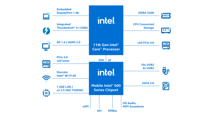 CPU 具有 20 個 PCIe 4.0 通道,PCH 亦有 30 個可程式化的高速 I/O 通道,這樣的條件能提供額外第 3 代 PCIe、USB 3.1 與 SATA 6Gbps 的組合,支援大量高速儲存、加速器、獨立顯示卡與乙太網路控制器。四個整合的 Thunderbolt™ 4/USB4 連接埠支援周邊裝置與顯示器。
