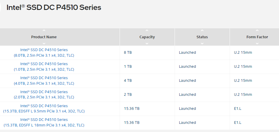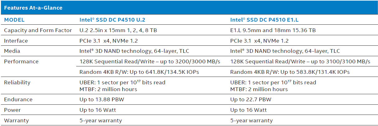 這些PCIe SSD的U.2 2.5英寸(15毫米)尺寸為1 TB,2 TB,4 TB和8 TB,E1.L尺寸為15.36 TB。作為第二代64Layer 3D TLC NAND的成員P4510。P4510捨棄HHHL而只保留了2.5'' 和E1.L兩種FF, 容量有1TB, 2TB, 4TB, 8TB 和15.36T。