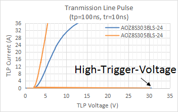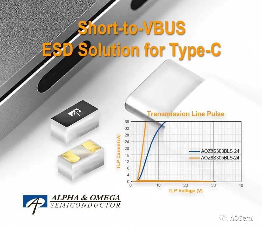 帶有PD協定的 Type C埠已成為筆記型電腦和智慧型手機的電源和數據標準埠, 供電電壓範圍在5V 至 20V 之間。 對於USB PD和快充等快速充電設備,擊穿電壓BV低於20V的傳統TVS用在USB Type-C保護上會存在短路或被損壞的風險,會引起相應的Type-C埠不能正常工作。 為了解決這個市場上的常見問題,AOS推出了兩款 TVS產品——AOZ8S303BLS-24 和 AOZ8S305BLS-24。 它們的高反向工作電壓滿足 USB-PD 埠的整個電壓範圍,此外,超低鉗位電壓和電容對高速信號線中的 ESD 保護進行優化,最大限度降低電容值,受保護的高速信號線包括但不限於 USB、Thunderbolt、HDMI 和 PCI Express 等。