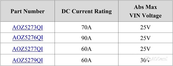 AOZ527xQI系列採用AOS最新一代的靈活智慧驅動IC和Gen Alpha MOSFET技術,以行業標準的5mm x 6mm QFN封裝提供優越性能。 該系列包括三個不同等級直流電流能力,優化多相控制器整體供電性能。
