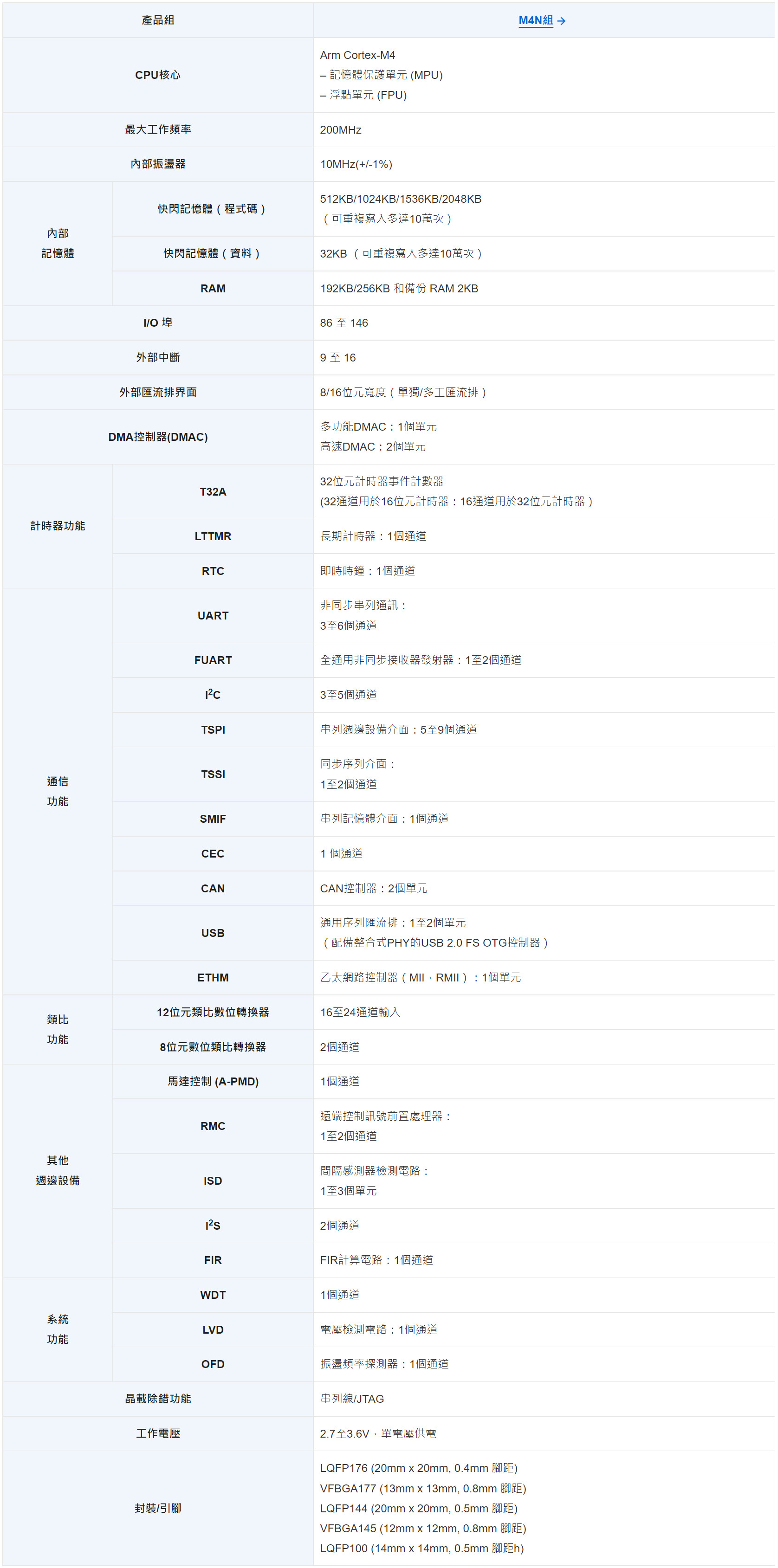 - 配備FPU的高效能Arm Cortex-M4核心,最高頻率為200MHz