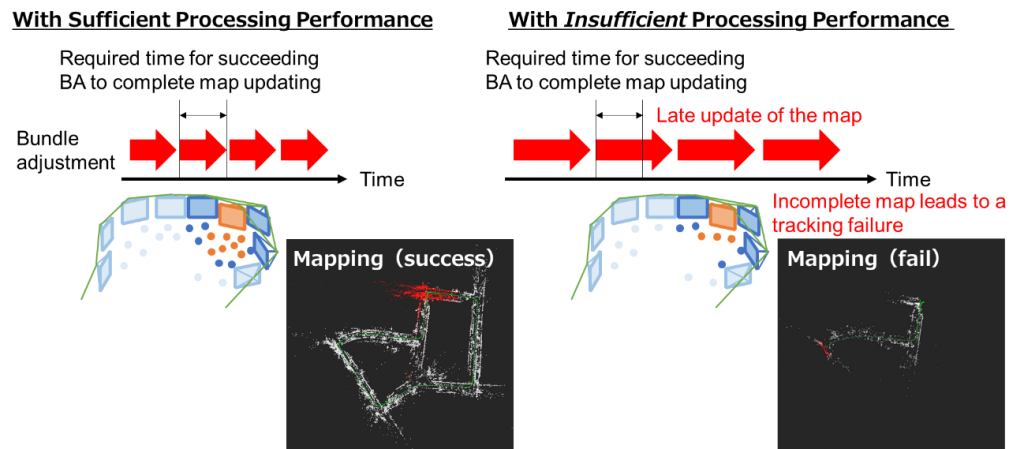近年來,隨著深度學習的引入,圖像識別技術取得了顯著的進步,深度學習的應用成為了視覺SLAM演進的重要因素。 然而,基於特徵點和相機方向優化地標的未知 3D 信息的束調整(BA)所需的大量計算是傳統方法的瓶頸。 對於 CPU 處理能力有限的邊緣型 SoC 設備,這會使實際處理變得困難。 (圖1)