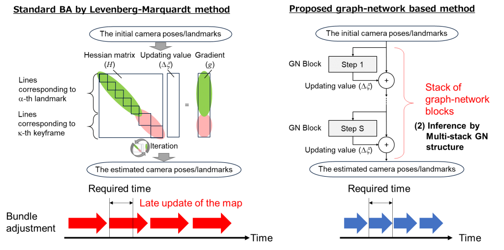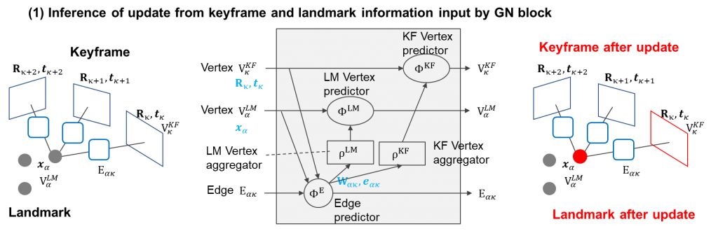為了應對這一挑戰,研究團隊提出了一種使用“圖網絡(GN)"[1] (一種圖神經網絡)通過推理進行近似計算的方法。 新方法包括從 GN block輸入的關鍵幀和地標信息中推斷更新信息(圖 2),並通過多堆棧 GN 結構收斂到最終值(圖 3)。 與使用傳統 Levenberg-Marquardt 方法的標準束平差相比,這些使得推理處理所需的計算量更少。