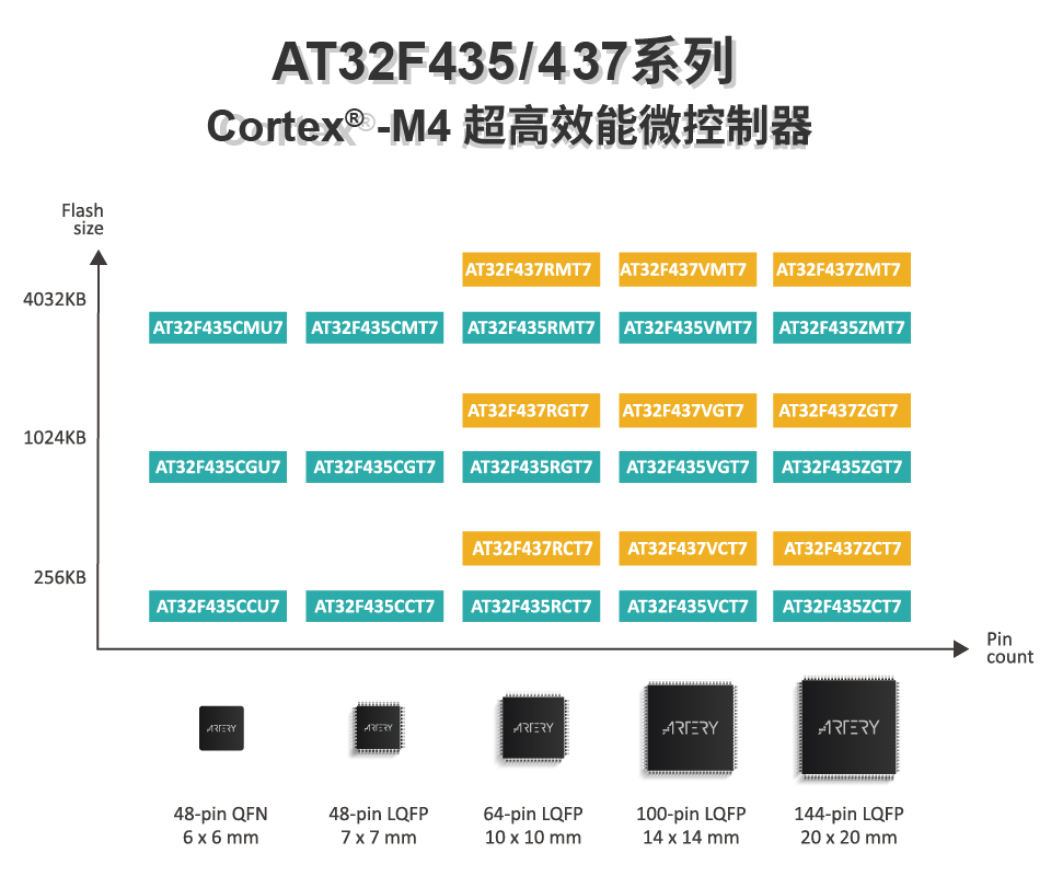 AT32F435系列提供了15個產品型號,包括QFN48, LQFP48, LQFP64, LQFP100, LQFP144等5種封裝類型選擇。AT32F437系列提供了9個產品型號,支持LQFP64, LQFP100, LQFP144等3種封裝形式。同時管腳皆相容於目前雅特力所有產品,便於客戶從既有系統進行開發升級。