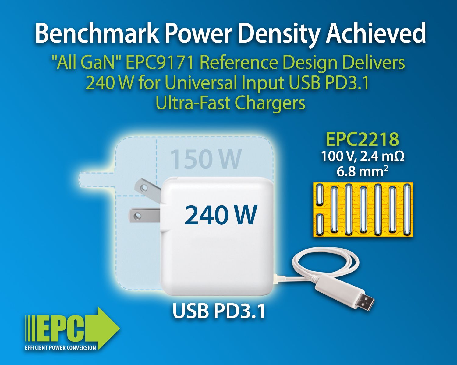 宜普電源轉換公司(EPC)宣佈推出 EPC9171,可將 90 V~265 V通用交流輸入電壓轉換為15 V~48 V直流輸出電壓,專為USB PD3.1超快速充電器而設計。此參考設計可在 48 V 輸出電壓和 5 A 負載下,提供 240 W 最大輸出功率。在一次側和二次側電路採用在高頻率下開關的氮化鎵功率元件,可實現約1.1 W/cm3的功率密度。