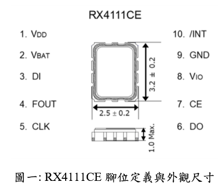 在備用模式下的耗電為100nA,為SPI的溝通介面,下圖一為RX4111CE腳位定義與外觀尺寸:
