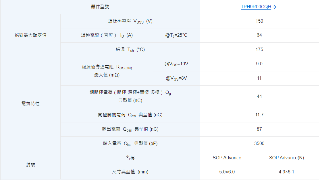 與使用當前一代「U-MOSVIII.-H」工藝的150V產品TPH1500CNH相比,TPH9R00CQH 的汲源極導通電阻下降約42%。 對新型MOSFET的結構優化促進實現汲源極導通電阻和兩項電荷特性[2]之間的平衡[3],從而實現了優異的低損耗特性。 此外,開關操作時汲極和源極之間的尖峰電壓降低,有助於減少開關電源的電磁干擾(EMI)。 該產品提供SOP Advance和更為廣泛採用的SOP Advance(N)這兩種類型的表面貼裝封裝。
