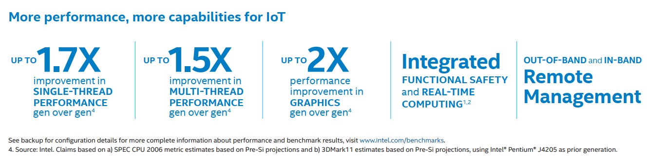 為了支持下一代物聯網邊緣設備,英特爾開發了一系列針對物聯網進行增強的新處理器:英特爾凌動® x6000E 系列和英特爾® 奔騰® 以及英特爾® 賽揚® N 和 J 系列處理器。這些處理器建立在新水平的 CPU 和圖形性能之上,具有集成的物聯網功能、實時性能、可管理性、安全性和功能安全性。