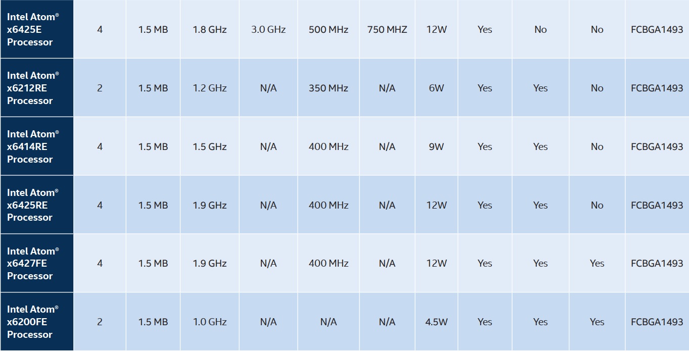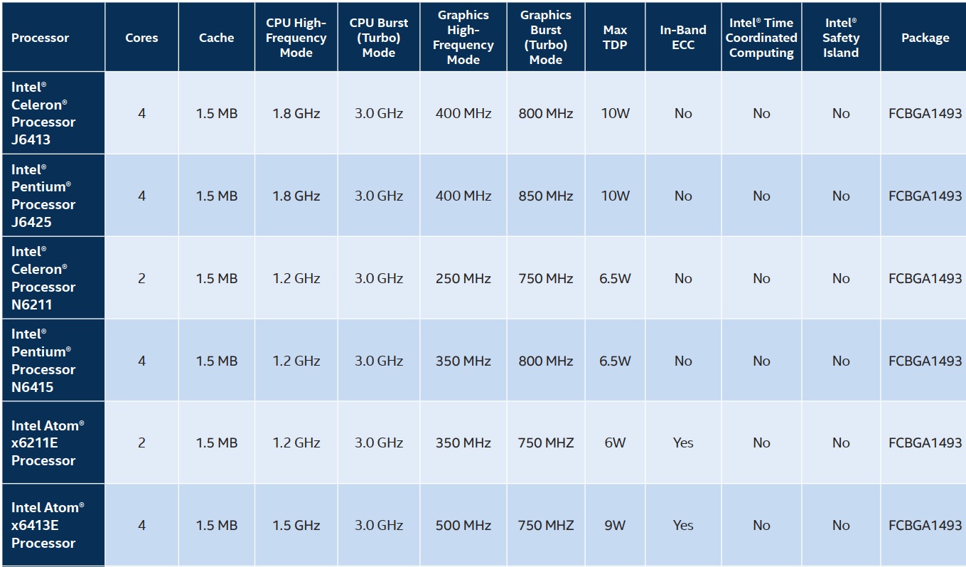 這些英特爾凌動、奔騰和賽揚處理器可選擇 12 針兼容選項,提供運行頻率高達 3.0 GHz 的各種雙核或四核選項,並支持高達 64GB 的 DDR4 和 LPDDR4/x 內存配置。 TDP 範圍介於 4.5W 和 12W 之間,可通過無源或有源散熱解決方案實現各種設計外形。