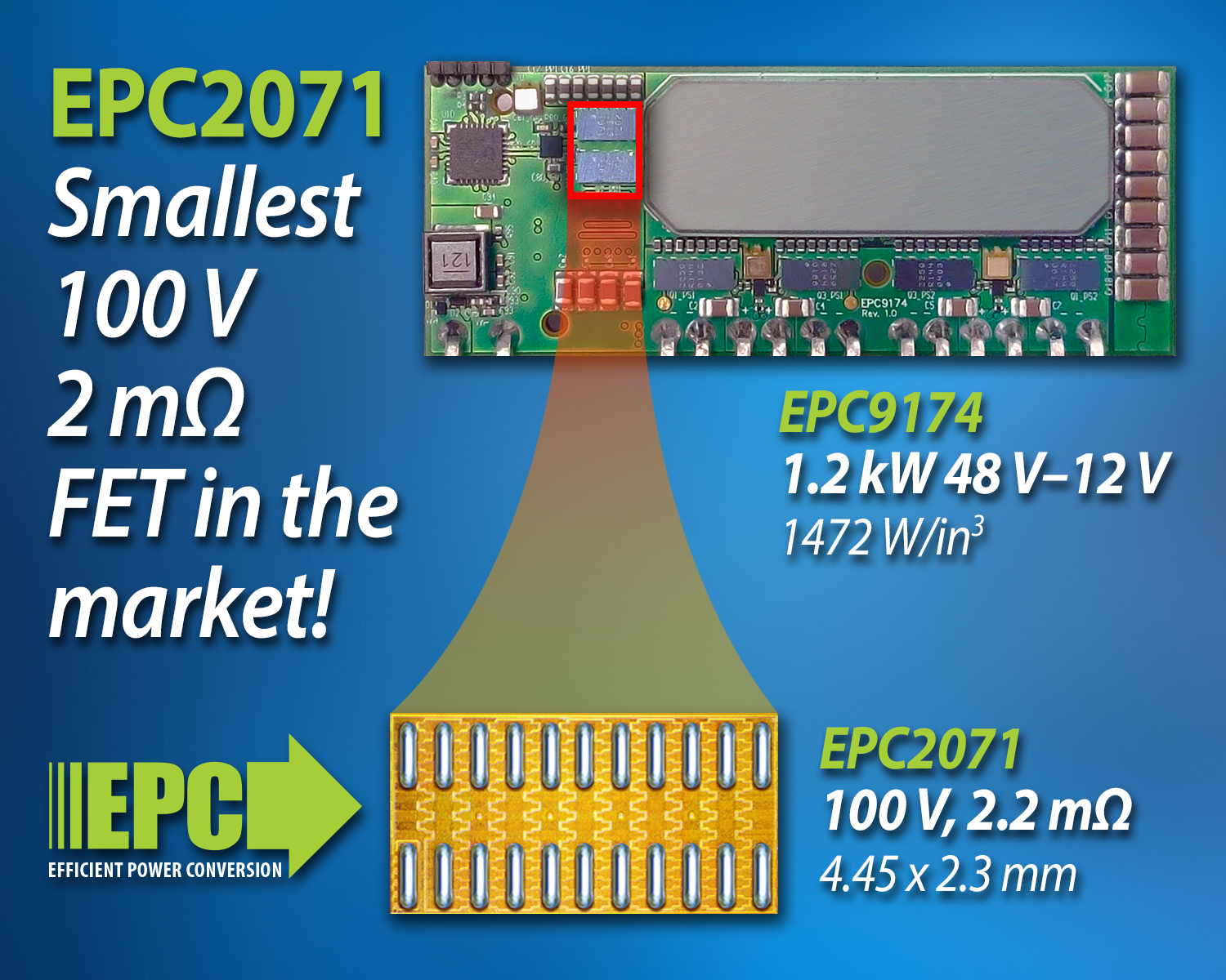 宜普電源轉換公司(EPC)新推100 V、2.2 mΩ的氮化鎵場效應電晶體(EPC2071),爲設計工程師提供比矽MOSFET更小、更高效的元件,用於高性能、佔板面積受限的應用。