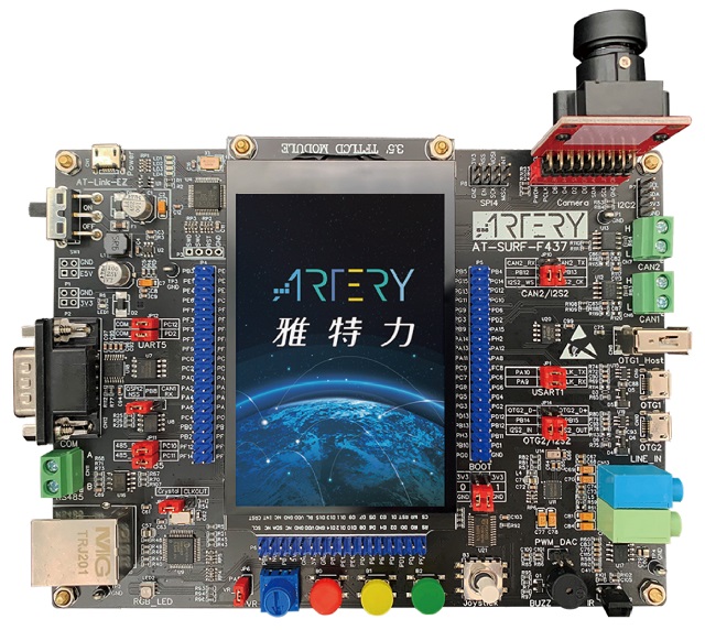 AT-SURF-F437以AT32F437ZMT7為中心,連接大容量SDRAM、QSPI閃存和RAM,外設配置三色LED燈,按鈕,兩個USB micro-B和一個type A的連接器,一個乙太網RJ45連接器,並配有數位攝像頭模組,麥克風及音頻輸入輸出模組,microSD卡介面,和各式通訊介面如RS-232、RS-485、以及兩組CAN收發模組,並配有3.5寸TFT-LCD觸摸屏,可完整體驗AT32F437各功能運行效果。
