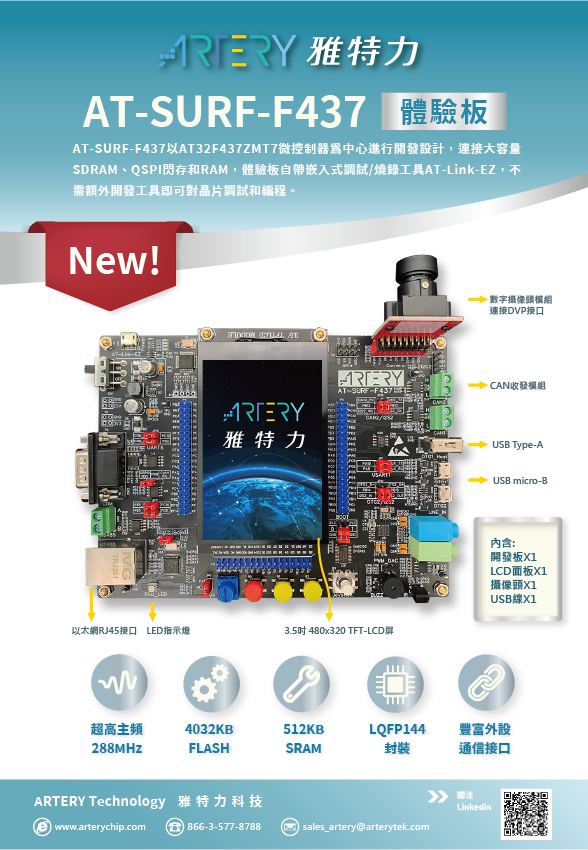 關於AT-SURF-F437雅特力官網還提供了快速上手指南、用戶手冊、設計文檔、配套SDK等完備的資料,幫助用戶快速上手,將更多的心思放到自己的應用實現上。體驗板套組包含開發板、LCD面板、攝像頭和USB數據線,目前已經正式開售,有需要的小夥伴可聯繫雅特力業務(sales_artery@arterytek.com)或代理商進行購買!