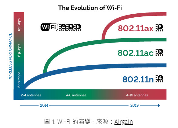最新一代的 Wi-Fi (Wi-Fi 6/6E) 工作頻率為 2.4/5/6GHz (6E),具有三頻連接功能,能夠分別實現 600Mbps、6.9Gbps 和 9.6Gbps 的理論數據速率(參見圖1)。雖然 Wi-Fi 6 和 6E 技術為每個空間流帶來千兆速度,但 Wi-Fi 6E 名稱支持 6GHz 無線頻譜,提供更寬的信道、連續的頻譜、更少的干擾和極低的延遲。