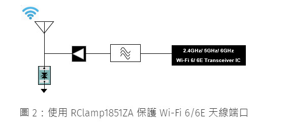 下面的圖 2 顯示了低電容、高線性度的 Semtech TVS,RClamp1851ZA,用於保護 Wi-Fi 6/6E 天線端口。