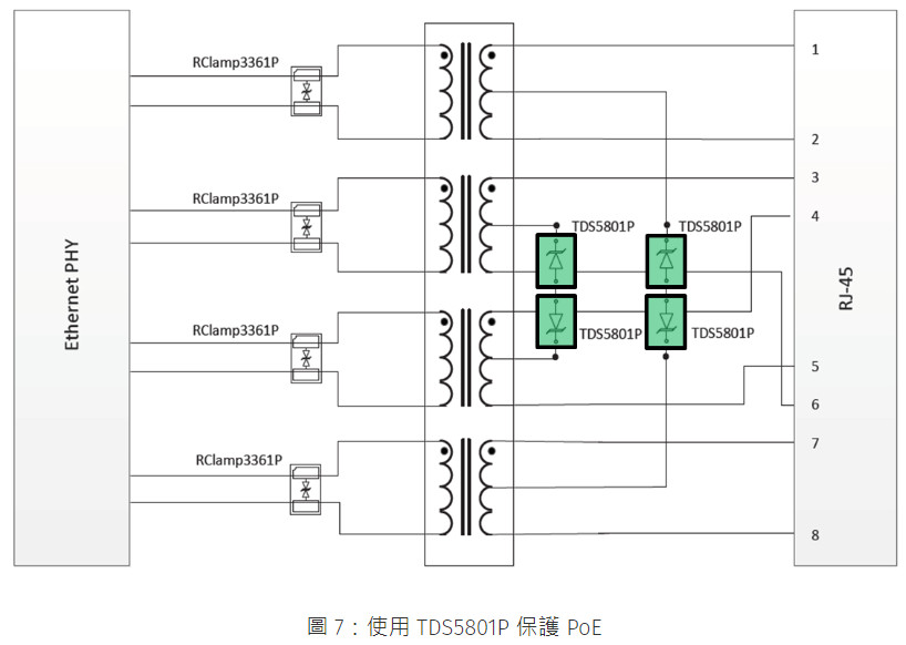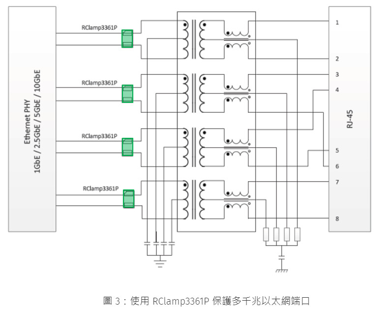 為了保持高速線路的信號完整性,將 TVS 引入的容性負載降至最低至關重要。此外,快速 TVS 開啟時間和低 ESD/浪湧箝位電壓將保護下游收發器免受有害瞬態能量的影響。下面的圖 3 顯示了低電容、低箝位、高浪湧的 Semtech TVS,RClamp3361P,可保護多千兆以太網端口。
