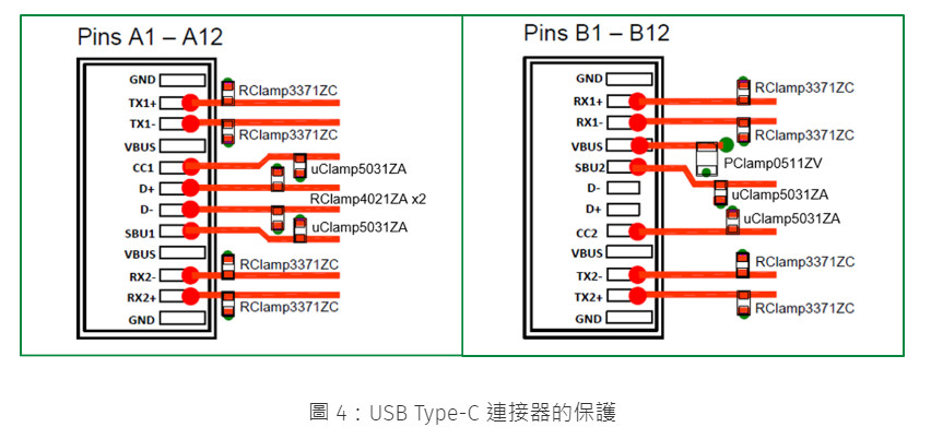 同樣,USB Type-C 端口也容易受到 ESD 和浪湧事件的影響。圖 4 顯示了推薦的用於保護 Type-C 引腳的 Semtech TVS 器件。