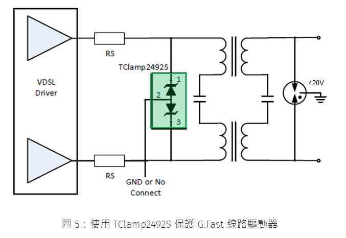 一些 Wi-Fi 6/6E 路由器集成了 xDSL G.Fast 調製解調器,可為 FTTx 應用提供類似光纖的速度。圖 5 顯示了 Semtech TVS 的示例,TClamp2492S 用於保護 G.Fast 線路驅動器。