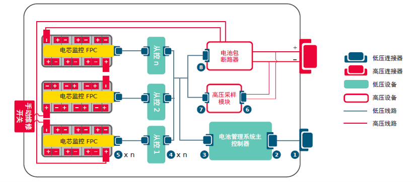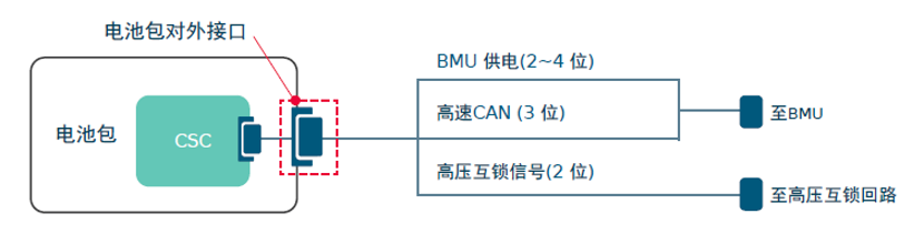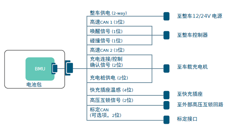 在大巴車及部分小型乘用車的電池系統中,電池管理模塊(BMU)位於電池包外部。在此類應用中,電池包內的電池管理從控制器(CSC)需通過電池包對外連接器接受BMU供電,並將實時採樣的電芯電壓及溫度信號通過CAN總線上傳至BMU。