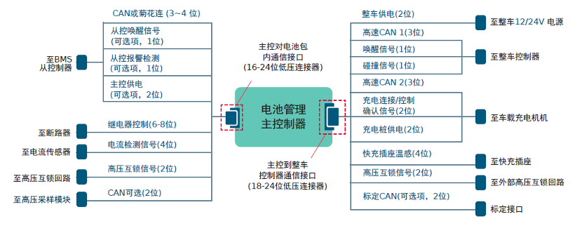 電池包對外通信接口是電池包內的電池管理模塊(BMU)與整車控制器(VCU)、車載充電機(OBC)等設備進行通信的接口。BMU實時監控電池包的總電流,總電壓,電芯電壓、溫度,電池包荷電狀態SOC(State of Charge)及健康狀態SOH(State of Health),並通過電池包對外通信接口與VCU、OBC進行信息同步,同時根據VCU、OBC的指令執行充放電動作。