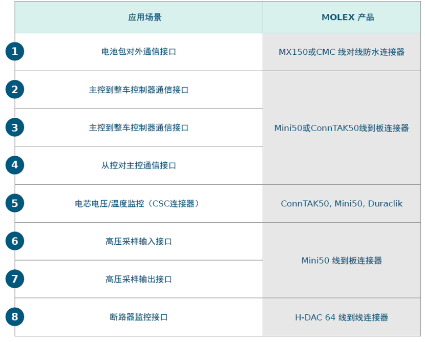 根據對電池包應用的研究及業內客戶的反饋,並結合產品的競爭優勢,Molex針對電池包內以下8處典型應用提供專用連接器解決方案: