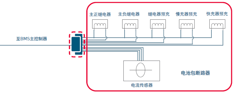 電池包斷路器中集成多個繼電器及電流傳感器。電池管理系統主控制器通過開關信號控制繼電器閉合狀態,實現電池包充放電狀態的轉換;同時主控制器讀取電流傳感器信號,監控充放電電流。
