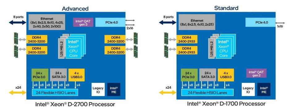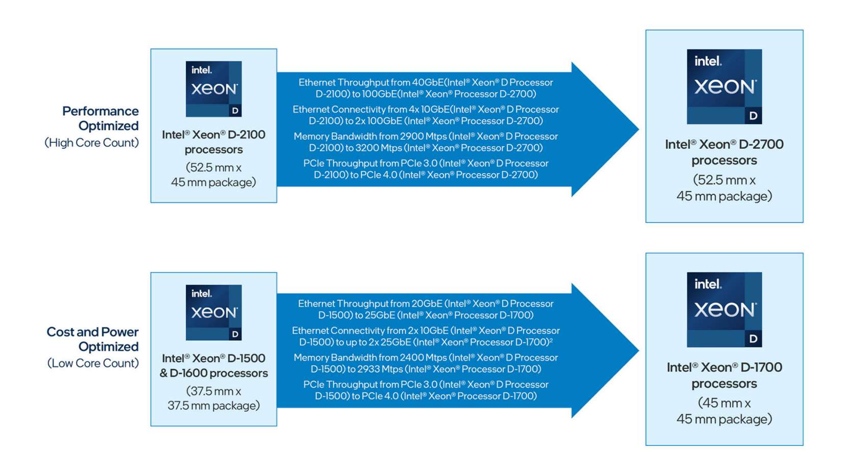 Intel® Xeon® D-2700 處理器是接替 Intel® Xeon® D-2100 處理器的產品,而 Intel® Xeon® D-1700 處理器則取代了 Intel® Xeon® D-1500 處理器與 D-1600 處理器。在任何情況下,升級都大幅改善了運算、記憶體與 I/O,更平衡也更符合成本效益。