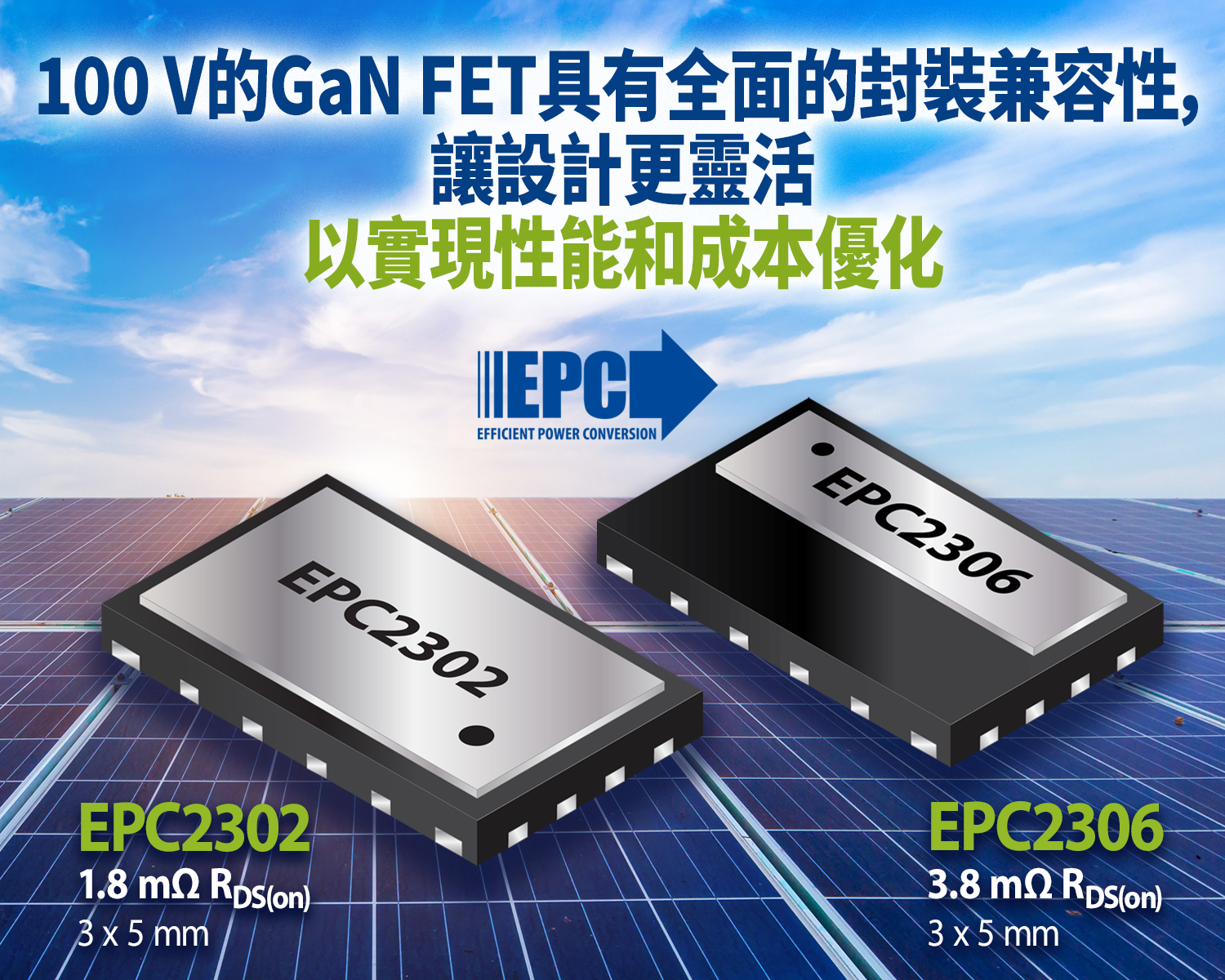 EPC2306 與之前推出的100 V、1.8 mOhm EPC2302 都是封裝兼容,從而允許設計工程師在導通電阻與價格之間權衡,在相同PCB佈局兼容兩種元件的封裝尺寸,從而可實現效率或成本優化的解決方案。