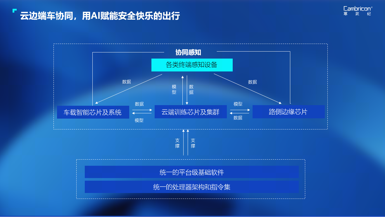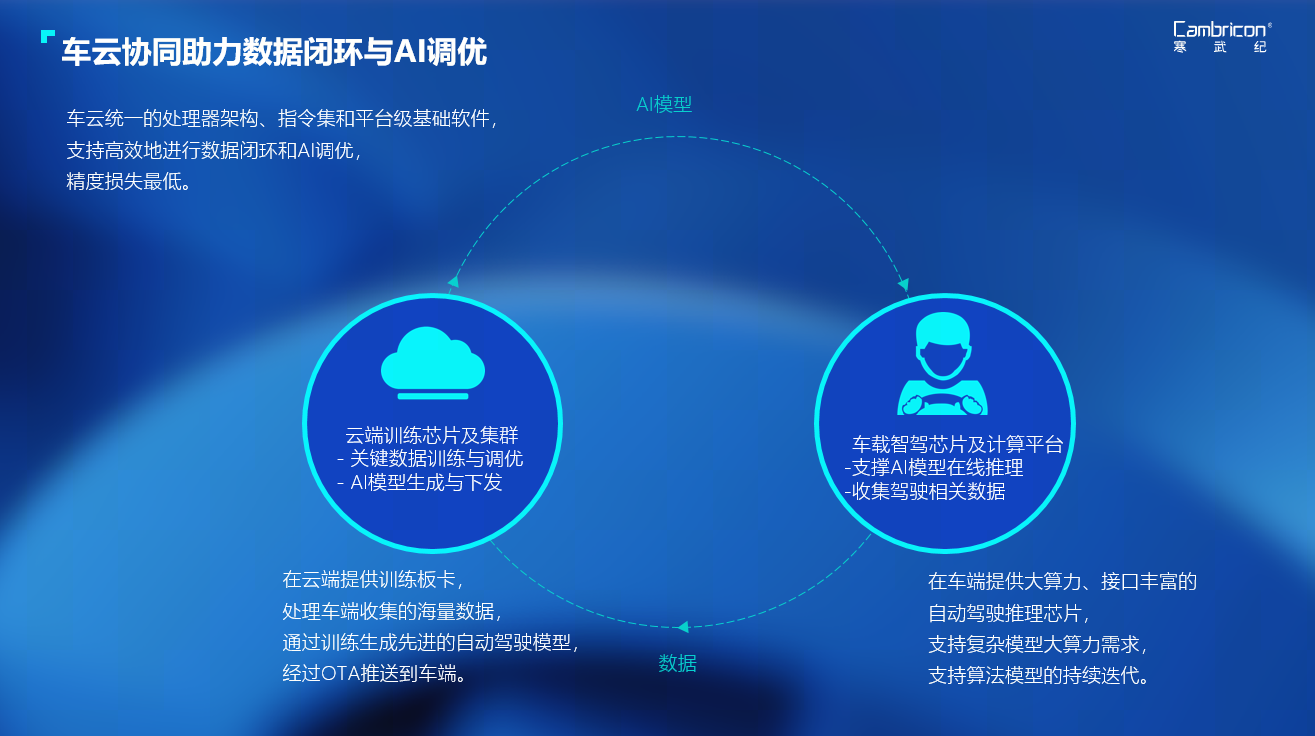 通過車雲協同助力,可以實現數據閉環和AI模型持續優化。在雲端,寒武紀擁有自己的訓練晶片和集群產品。在車端,寒武紀行歌未來提供的車載智能晶片和計算平台將支持AI模型的在線推理。通過車雲協同,能夠將車端的數據快速回傳,實現AI模型的快速疊代升級。