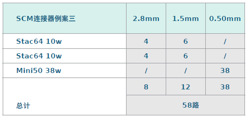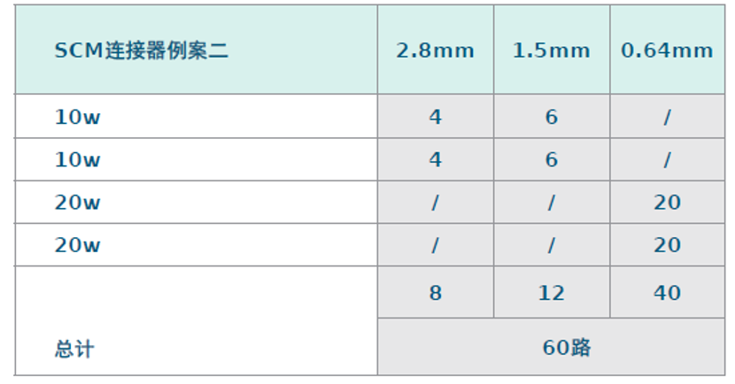 - SCM設計常選用30~80個0.5或0.64mm端子用於I≤3A的傳感器等較小負載和CAN&LIN、電機控制信號傳輸及開關控制等;