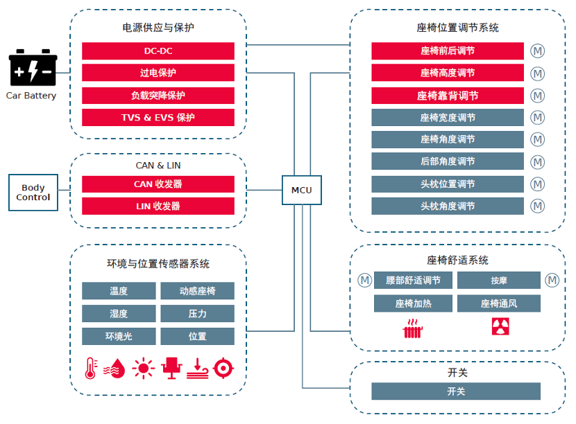 SCM在設計除座椅方向調節功能以外也會增加其它舒適化與智能化功能,如座椅記憶、座椅加熱、通風、按摩等功能。