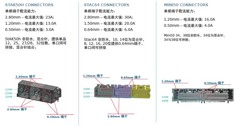 Molex stAK50h、Stac64、Mini50選用了被汽車行業廣泛接受的端子系統,在一套連接器內實現CAN, LIN及電源的功能需求,做到了連接器標準化