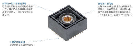 允許 Sentrality 插座在波形彈簧之間浮動。在對配期間,插座可以平行於印刷電路板平面徑向自由移動+/- 1.00 毫米,因此插柱不會變形
