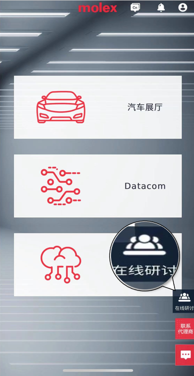 方式二:進入“Molex莫仕連接器”官方公眾號,點擊“體驗”,點擊“參觀展廳”,進入Molex虛擬展廳,註冊並登錄虛擬展廳