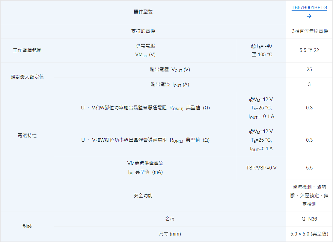 新品TB67B001BFTG使用東芝的DMOSFET [1] 作為輸出功率晶體,最高額定輸出電壓25V ,最大額定輸出電流3A [2] 。此外,還內建了超過最大轉速頻率的異常轉速頻率檢測功能。 TB67B001BFTG內建更高頻率的振盪器,異常檢測旋轉頻率最大為1.875kHz ,比現有產品TB67B001FTG提高25% ,可進行高速電機運轉控制。