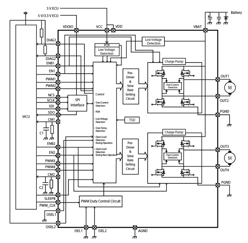 - 輸出驅動IC:2通道驅動,2通道並聯提供額定電流為10 A [ 1]單通道驅動,4通道半橋驅動