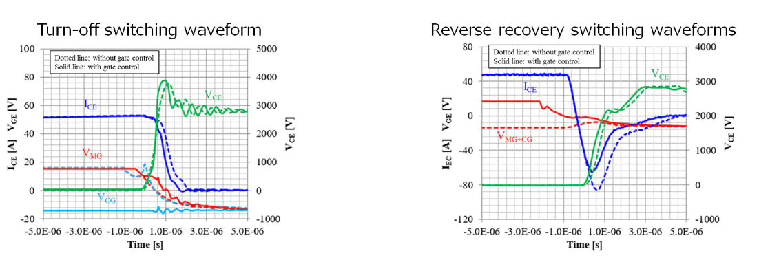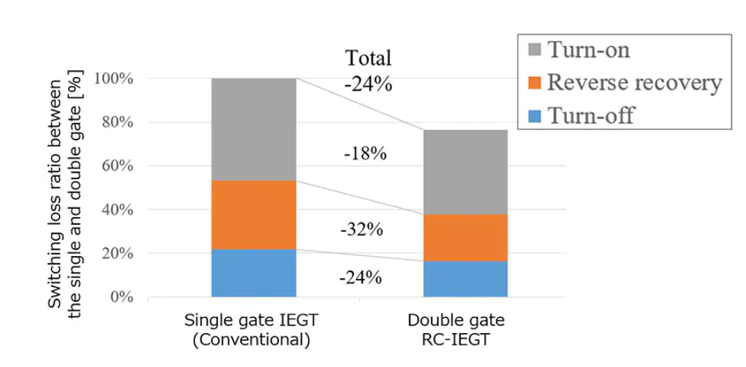 新開發的雙柵極RC-IEGT結合柵極控制技術,關斷和導通損耗[7]分別比傳統單柵極結構降低24%和18%[4] ,反向恢復損耗降低32%[4]。 因此,實際測量值中總開關損耗降低24%[4],而導通損耗沒有任何增加。