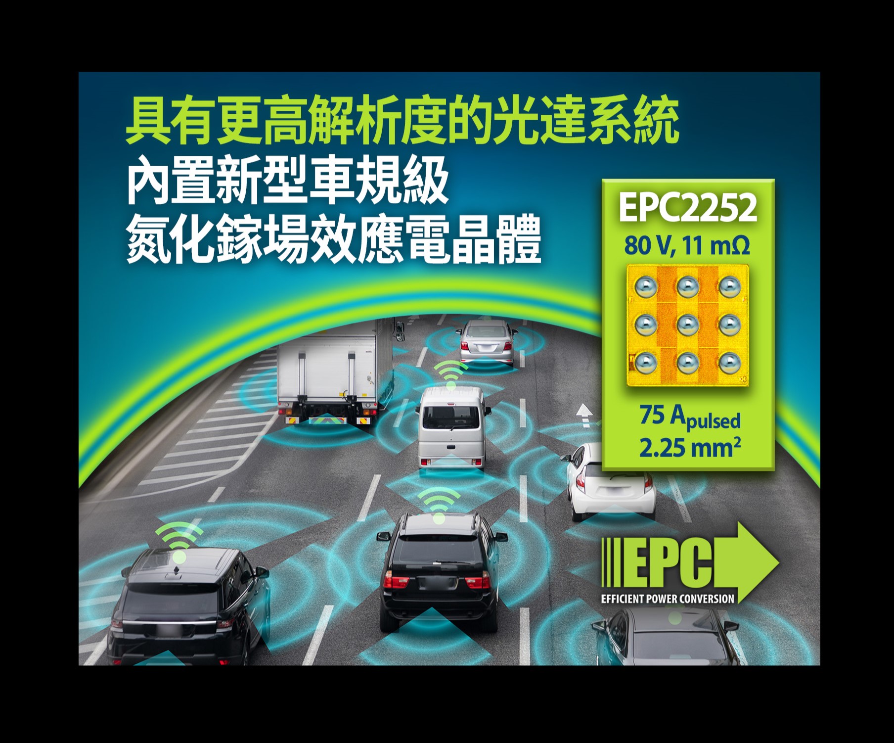 EPC推出80 V、通過AEC-Q101 認證的氮化鎵場效應電晶體(GaN FET)EPC2252,為設計人員提供比矽MOSFET更小和更高效的解決方案,用於車規級光達、48 V/12 V DC/DC轉換和低電感馬達控制器。
