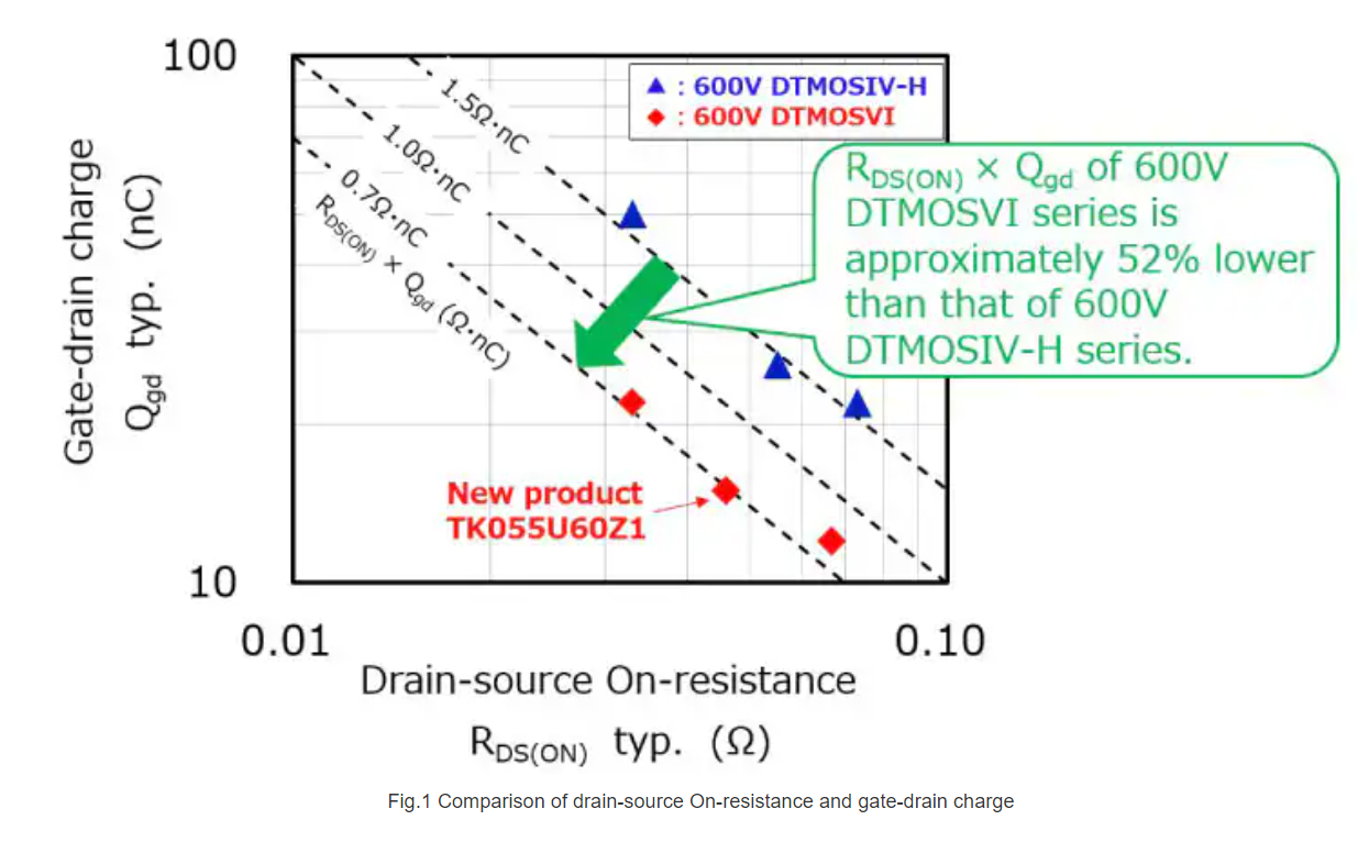 透過最佳化閘極設計和製程,與具有相同漏源電壓額定值的Toshiba當前一代DTMOSIV-H系列產品相比,600V DTMOSVI系列產品單位面積漏源導通電阻降低約13%,MOSFET性能品質因數漏源導通電阻×閘漏電荷約降低52%,從而確保該系列同時實現低導通損耗和低開關損耗,有助於提高開關電源的效率。