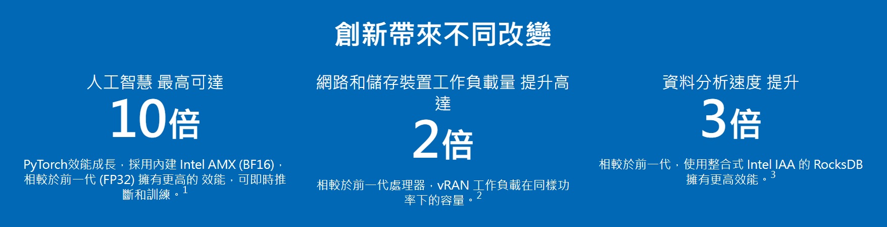 第 4 代 Intel® Xeon® 可擴充處理器旨在為嚴苛的邊緣工作負載提供最強大的運算,帶來更高的效能、更快的 DDR5 記憶體速度、以 80 條 PCIe Gen 5.0 通道供應更強大的 I/O 支援,並提供市場上最多的內建加速器。