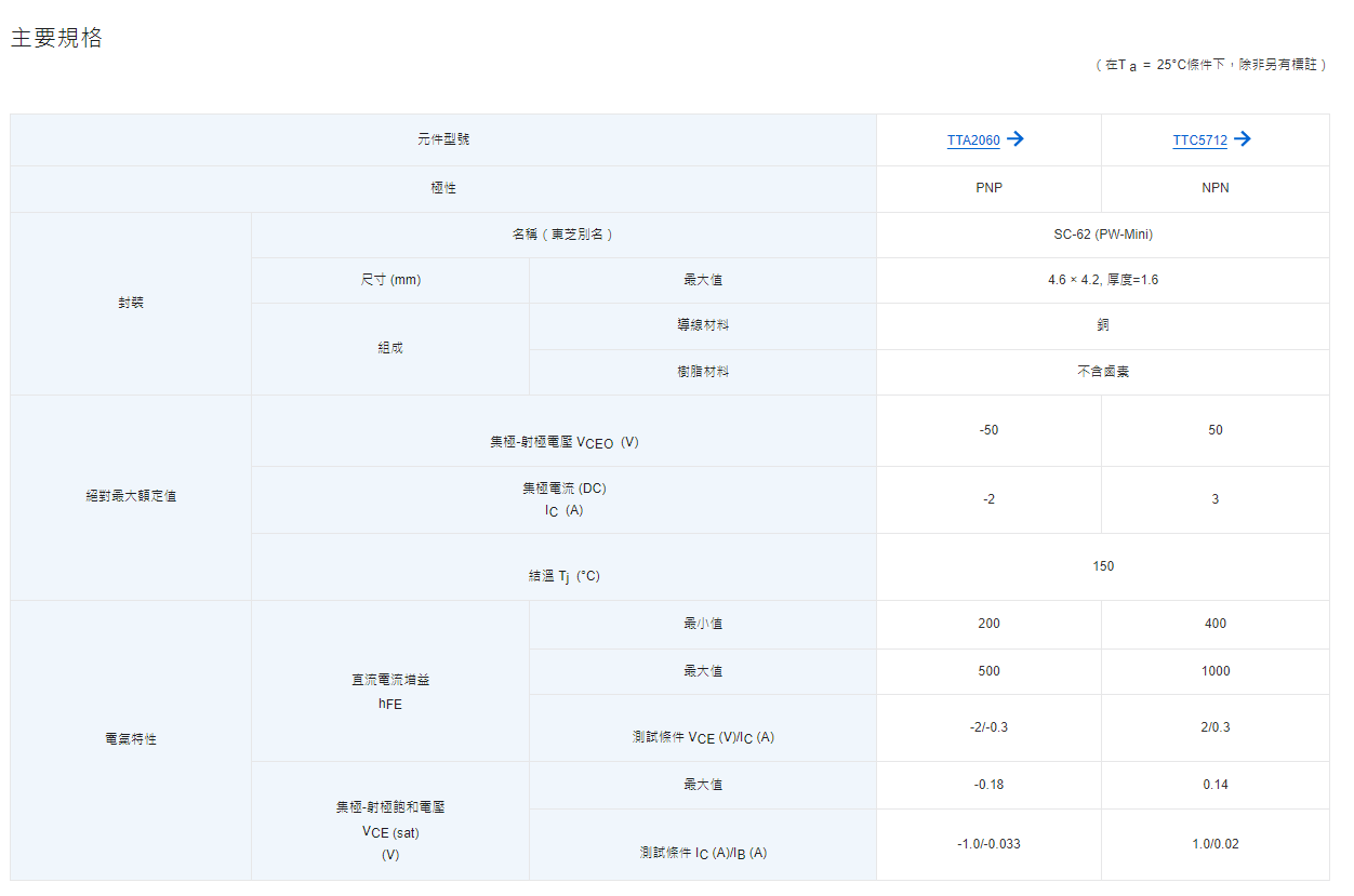 TTA2060的集極-射極額定電壓和集極額定電流(直流)為-50V/-2A ; TTC5712的集極-射極額定電壓和集極額定電流為50V/3A 。