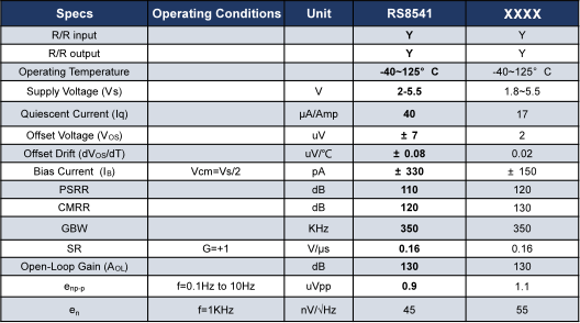 RS8541是一款低功耗、零漂移、軌對軌輸入輸出的精密運算放大器,它的工作電壓範圍在2v到5.5v,失調電壓為±7uV,失調電壓溫漂為±0.08uV/°C的,它具有低至40uA的靜態電流,這些特性保證了它的高精度和低功耗。 電源抑制比為110db,共模抑制比為120dB,提高了抗電源噪聲和共模干擾的能力,130dB的高開環增益也保證了運放的高精度。 Rs8541的這些特性也使其廣泛應用於各種傳感、儀表、醫療器械以及精密計量設備等。