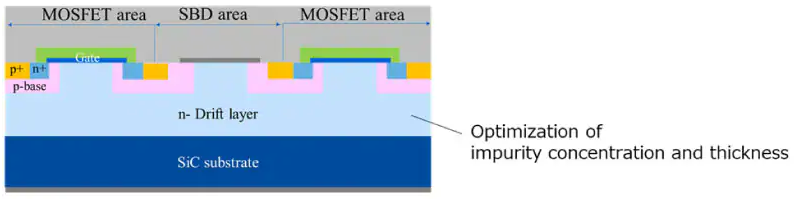 東芝在現有SiC MOSFET產品的基礎上優化漂移層的濃度和厚度,開發出內置2200 V SBD的SiC MOSFET(注3),可相容於DC 1500 V系統中的2-Level 變頻器。具體來說,它的設計目的是保持與我們現有產品相同的導通電阻-耐壓權衡,同時實現光伏應用對宇宙射線的高破壞性抵抗力。此外,通過與現有產品一樣採用內置式SBD,我們抑制了寄生二極體(注4)導通引起的低可靠性,並確認了逆向導通時的高可靠性。