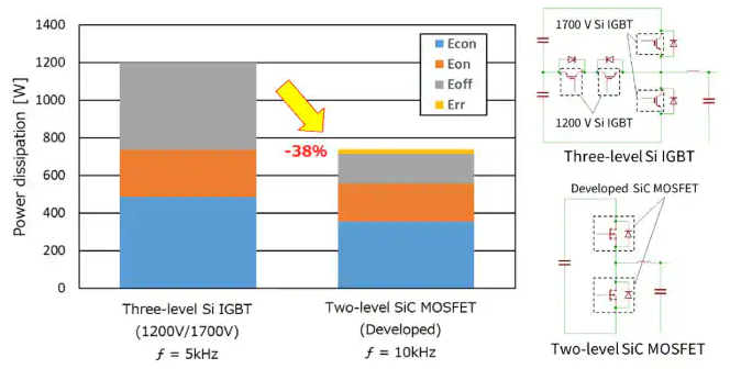 傳統3-Level Si IGBT和新開發的2-Level SiC MOSFET的變頻器損耗比較