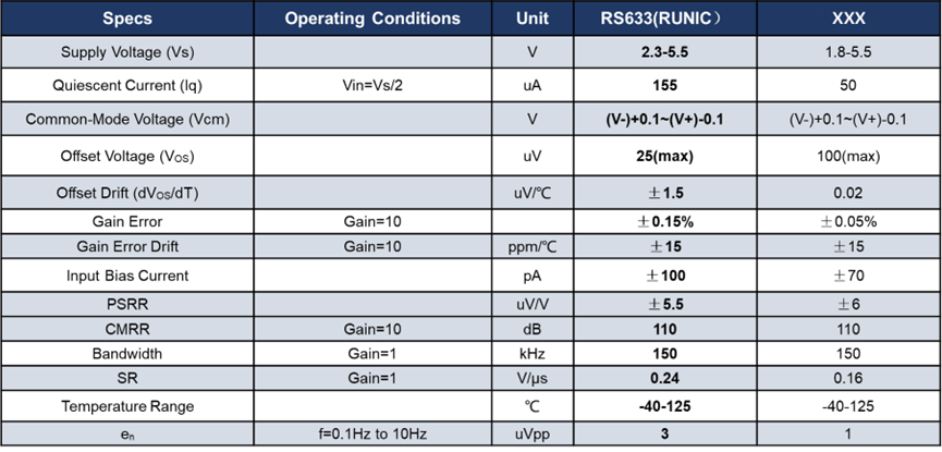 RS633是一款微功耗、零漂移、軌對軌輸出的儀表放大器。 它具有最大25uV的失調電壓和±1.5uV/°C的失調電壓溫漂、低至2.3V的工作電源電壓和155uA的靜態電流,實現了高精度和低功耗,零漂移也確保了它在各種工業溫度範圍內的高精度。 目前RS633是10倍增益版本,固定增益節省了配置增益所需的高精密外置電阻。 RS633的這些特性使其適用於各種傳感器放大器、儀表、衡器、數據採集等應用。