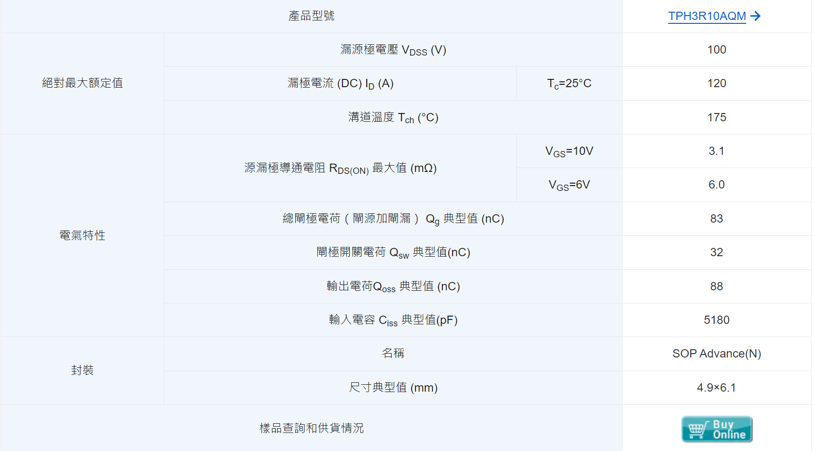 - 業界領先的[2] 出色低導通電阻:RDS(ON)=3.1mΩ(最大值)(VGS=10V)