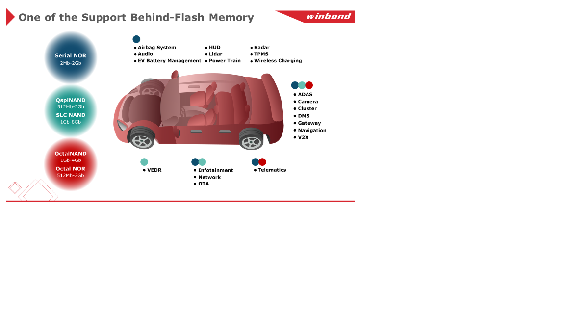 華邦電子快閃記憶體已廣泛應用在多項汽車裝置上,包括了無線通訊系統、雷射雷達、胎壓檢測器、車載無線充電系統、電動車電池管理系統、安全氣囊系統、抬頭顯示器、電力管理系統、音響影音系統、OTA無線更新系統,覆蓋了網路通信、行車記錄器,並可支援V2X各項應用,汽車導航、數位儀錶板,以及駕駛監控與互動系統、汽車閘道器,閘道相機等車載領域。