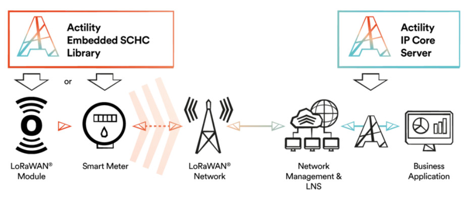 - 嵌入裝置中的庫(在 CPU、通訊模組或 SoC 上):Actility SCHC 庫