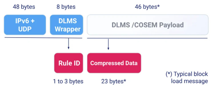 圖 3:由Actility SCHC 壓縮的 DLMS/COSEM 訊息,用於透過 LoRaWAN 傳輸 - 標頭的壓縮率為 90%,當 SCHC 應用於整個 IPv6/UDP/DLMS 封包時,壓縮率為 75%。圖片由Actility提供