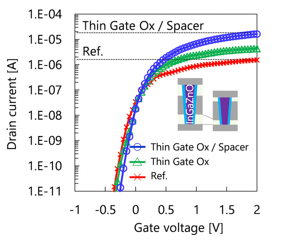 圖 2:已開發 InGaZnO 電晶體的 (a) ON 及 (b) OFF 電流特性